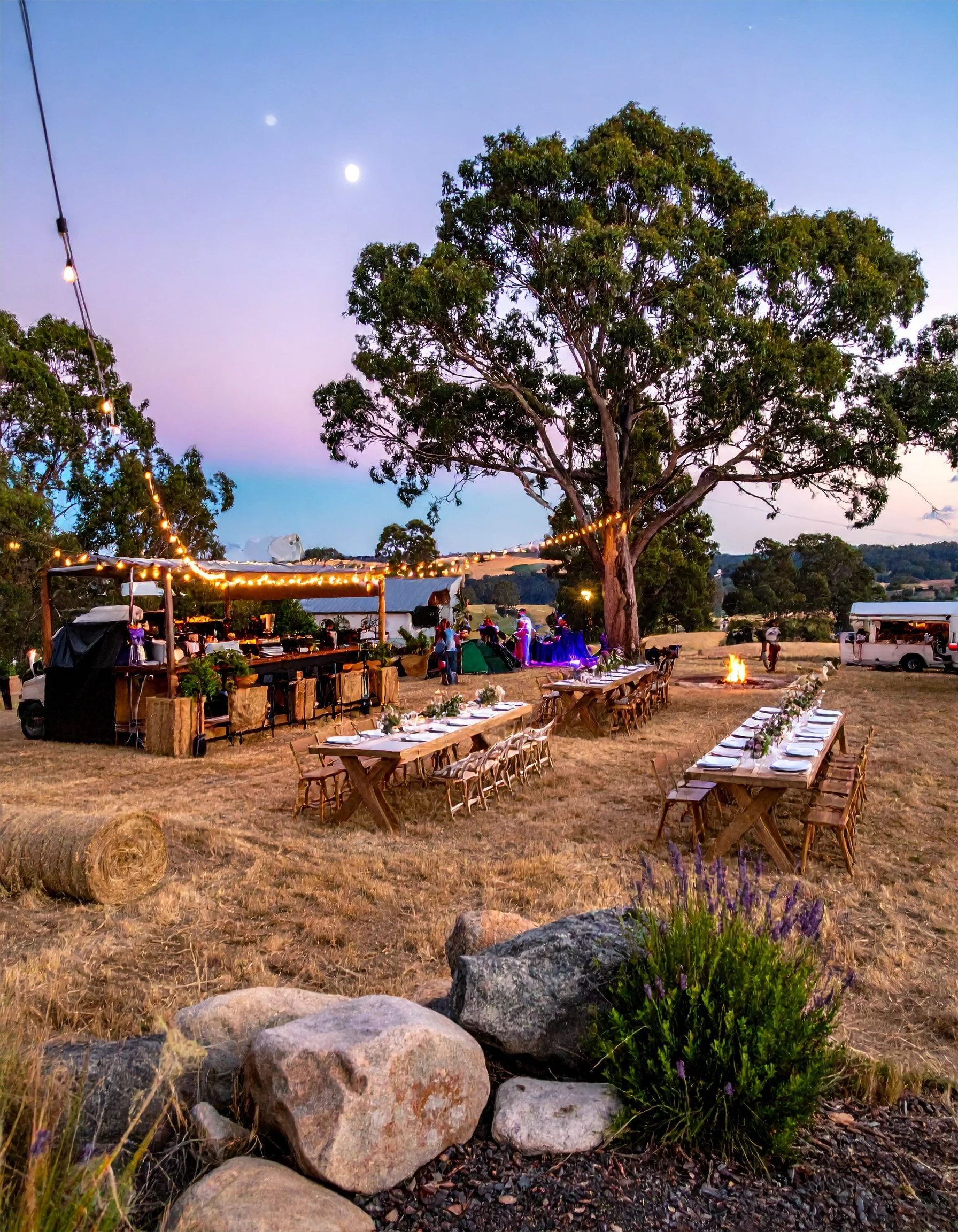 With a crackling fire pit in winter, a dance floor for the grooves, and plenty of local food vendors to satisfy any taste. Toilets are available onsite and hale bales galore for that true farm seating experience.